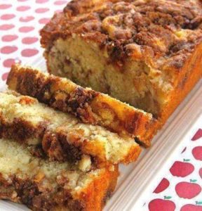 Combine flour and baking powder together in another bowl; stir into creamed butter mixture. Mix milk into batter until smooth. Pour half the batter into the prepared loaf pan. Next add half the apples and half the brown sugar cinnamon mixture. Lightly pat apple mixture into batter.
