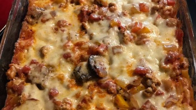 - Spoon just enough of the sausage/vegetable mixture to cover the bottom of a 9×13 pan.