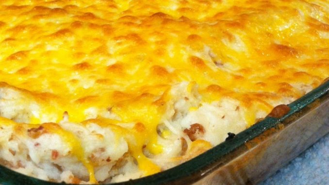 Meanwhile, microwave the potatoes according to package instructions. In a large bowl, mix together potatoes, butter and evaporated milk with a mixer until smooth. Stir in bacon and fried onions. Spread evenly on top of beef mixtures and sprinkle with cheese.
