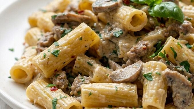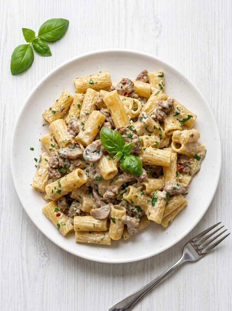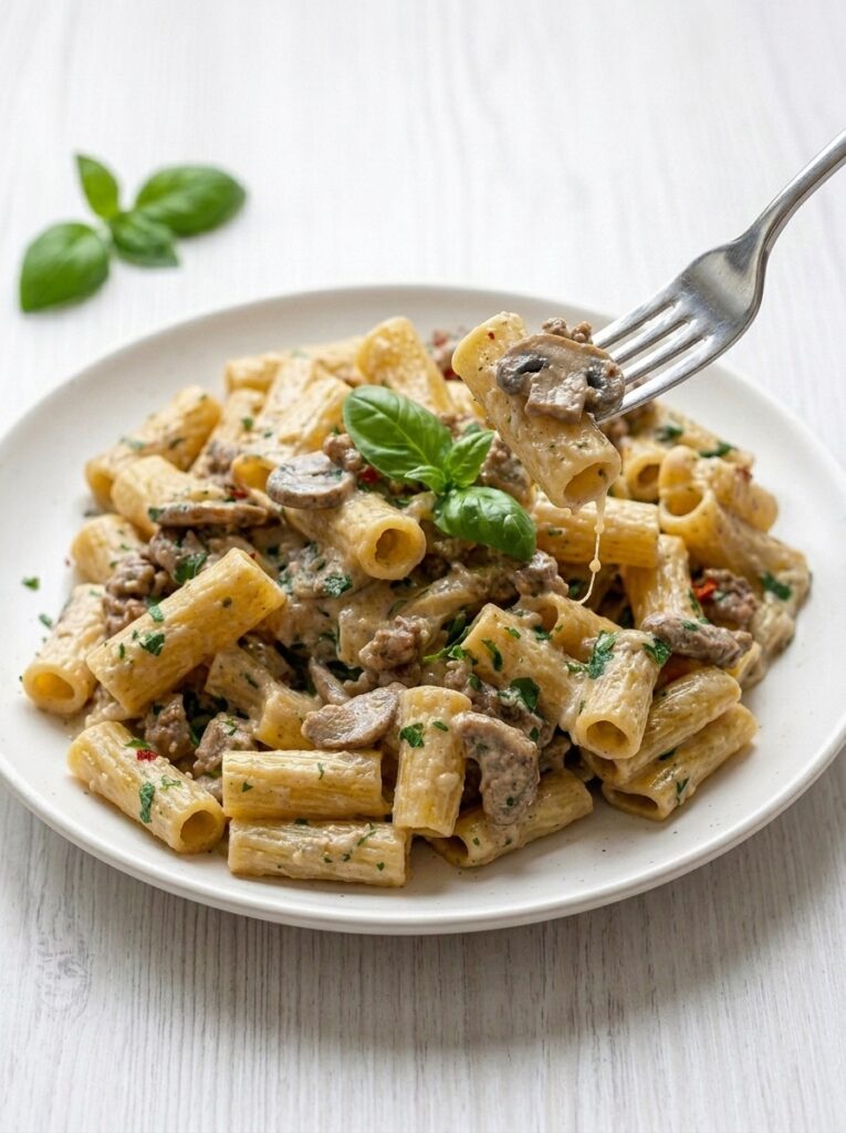 We are big pasta people in this house, and pairing it with Italian sausage is one of those combinations that never gets old. This time I switched things up with Italian-seasoned chicken sausage instead of the classic pork — lighter, but still packed with that herby, savory flavor we love. Add a silky cream sauce, golden mushrooms, a splash of white wine, and a shower of Parmesan, and you’ve got a weeknight dinner that feels anything but ordinary.