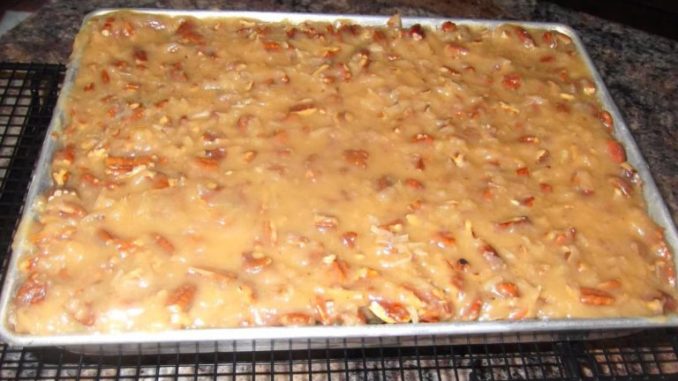 8FOR THE FROSTING: Melt butter in heavy saucepan. Add milk, sugar, vanilla and egg yolks and cook over medium heat for about 12 minutes, stirring constantly until thickened. Remove from heat and add coconut and pecans. Stir until combined. Pour warm frosting over cooled cake.
