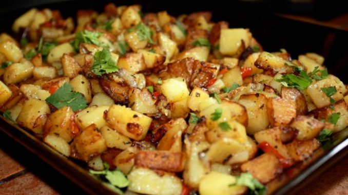 Pour potatoes onto two rimmed baking sheets. Bake for 20 to 25 minutes, shaking the pan twice.