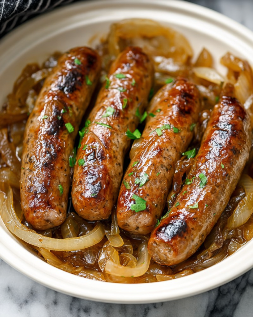 Slow cook until tender: Cook on LOW for 6–8 hours, or on HIGH for 3–4 hours, until the onions are very soft and translucent, the sausages are cooked through and tender, and the liquid has darkened into a rich brown onion gravy.