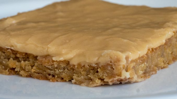 6. For frosting: In a saucepan, bring 1 stick butter and ½ cup peanut butter to a boil. Add 2 tablespoons milk and slowly mix in powdered sugar until well combined. Pour frosting over cake, spreading evenly to edges. Allow frosting to cool and set before serving.