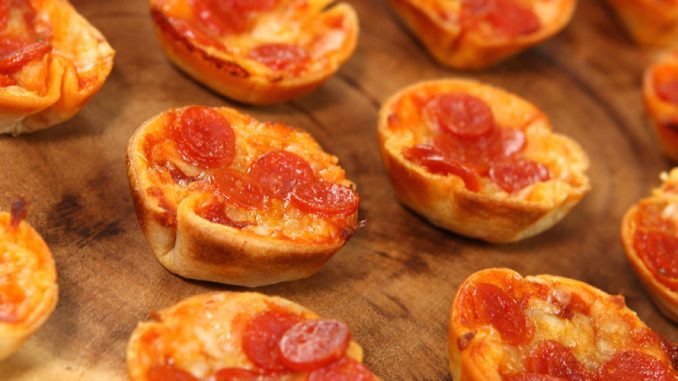 - Fit a tortilla circle into each of 12 muffin tins, pressing carefully to make sure there is an opening in the center. Scoop 1 tablespoon pizza sauce into each muffin tin. Sprinkle with mozzarella cheese, topping with 3 mini pepperonis each.