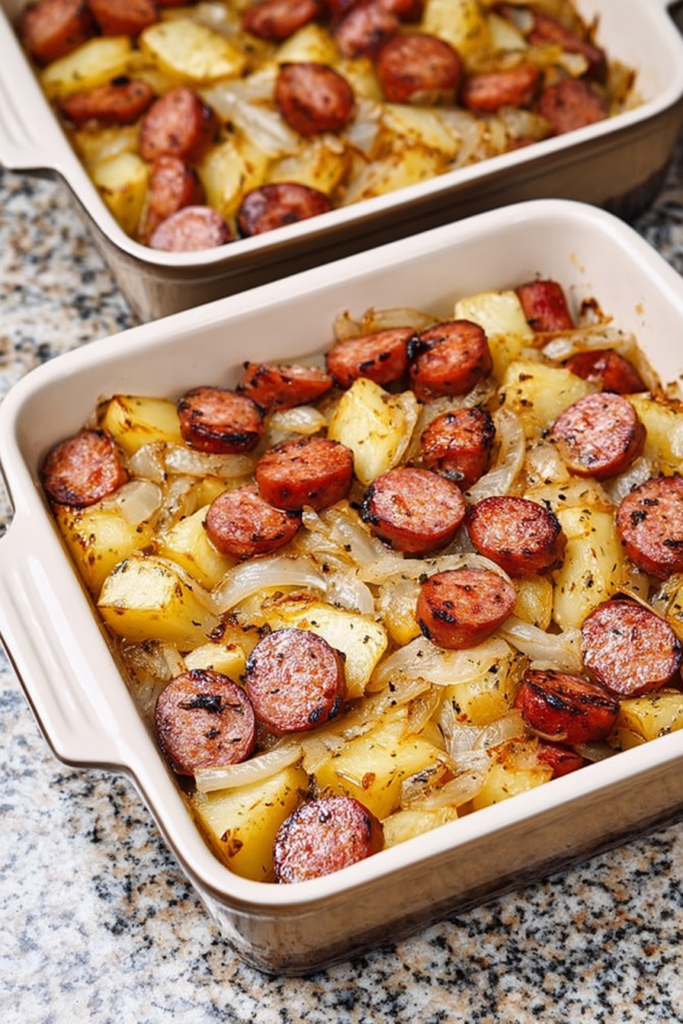 Grandma Bev’s rule: if it’s bubbling at the edges, it’s ready to make everyone happy. This sausage and potato casserole is exactly that kind of dish—simple, cozy, and built from pantry staples. Smoked sausage, onions, and potatoes bake together until the sausage coins are browned and the potatoes turn tender with caramelized edges. It’s very much a Midwestern-style oven supper: practical, budget-friendly, and designed to feed a hungry crowd with minimal fuss. You slide the pans into the oven, wait for that bubbling edge and toasty top, and dinner is done.