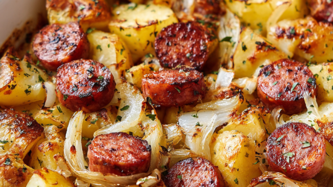 Grandma Bev’s rule: if it’s bubbling at the edges, it’s ready to make everyone happy. This sausage and potato casserole is exactly that kind of dish—simple, cozy, and built from pantry staples. Smoked sausage, onions, and potatoes bake together until the sausage coins are browned and the potatoes turn tender with caramelized edges. It’s very much a Midwestern-style oven supper: practical, budget-friendly, and designed to feed a hungry crowd with minimal fuss. You slide the pans into the oven, wait for that bubbling edge and toasty top, and dinner is done.