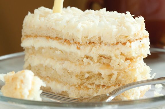 Frost the top and sides of the cake then sprinkle the tops and sides with remaining coconut flakes.